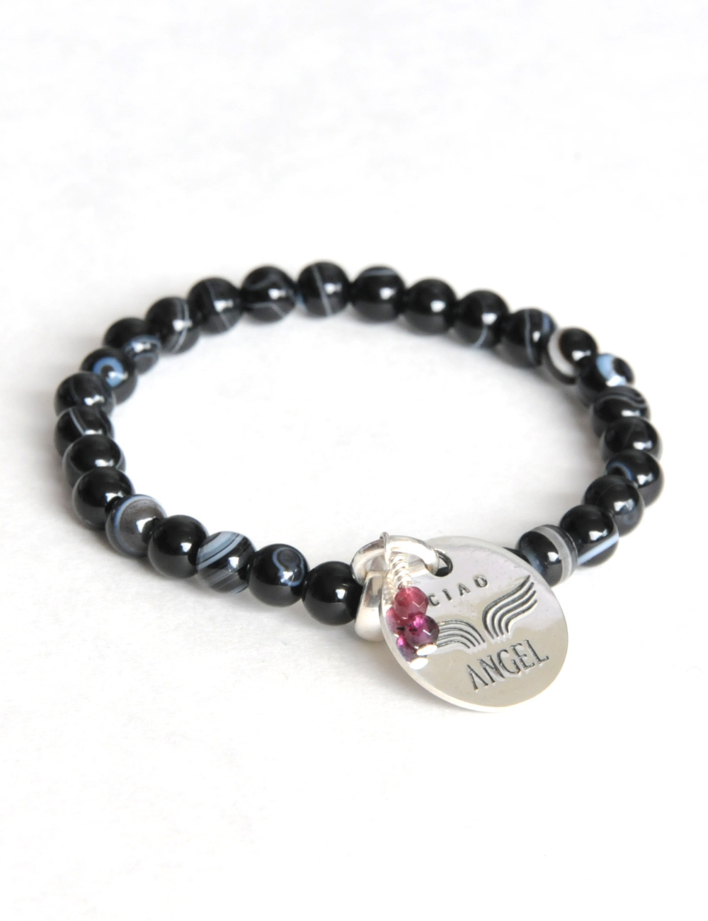Bracelet de pierre gemme - onyx 6mm et grenat 3mm, médaille Ciao Angel et rondelle en argent 925