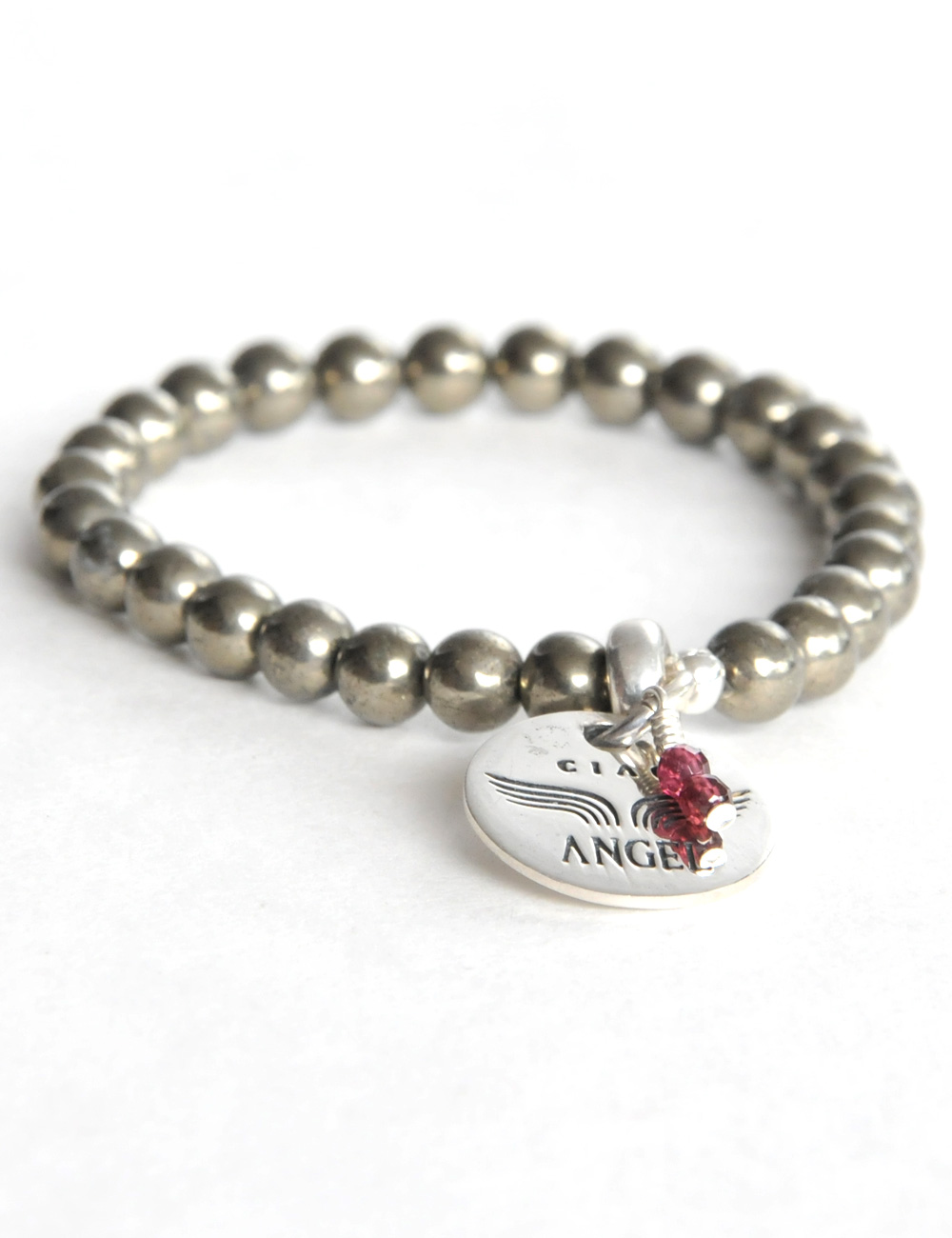 Bracelet de pierre gemme - pyrite 6mm et grenats 3mm, médaille Ciao Angel et rondelle en argent 925