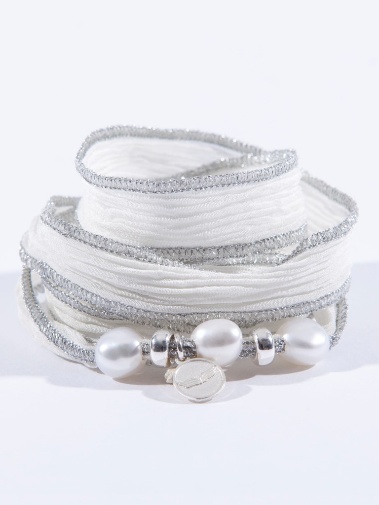 Ruban de soie, perles d’eau douce blanches, cerclées de forme baroque (poire, ovale ou semi-ronde). Le ruban mesure environ 34″ (87cm). On peut faire 3, 4 ou 5 tours, selon la grandeur du poignet. On l’attache tout simplement par un noeud plat.